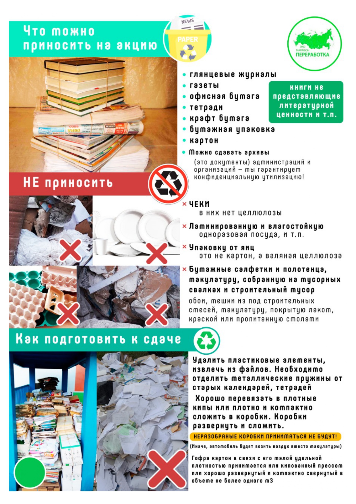 Вторичной переработке подлежат: глянцевые журналы, газеты, офисная бумага, тетради, крафт бумага, бумажная упаковка, книги, не представляющие литературной ценности и т.п.